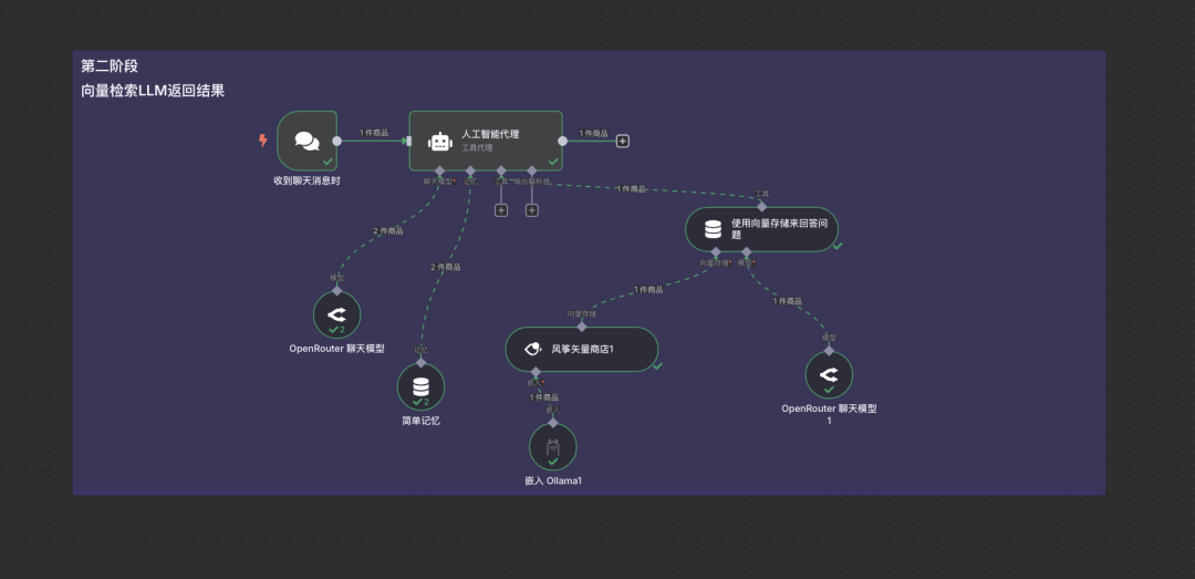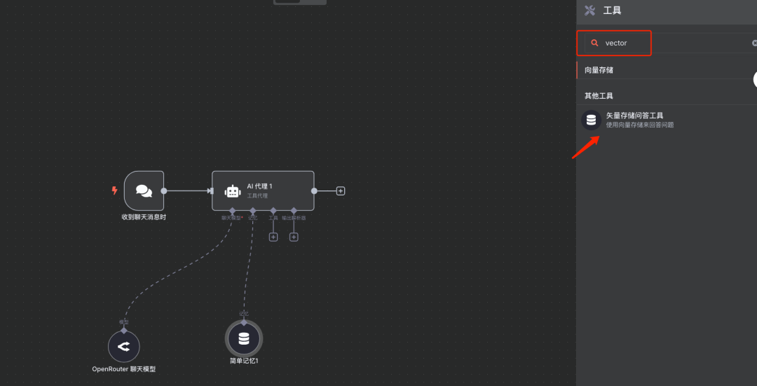 说明:采用N8N提供的向量数据库问答工具,LLM会调用此工具进行向量检索并将结果返回。(输入关键字vector