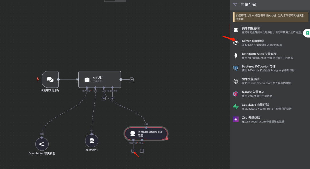 说明:输入“vector”关键字搜索,并选择Milvus相关的组件。