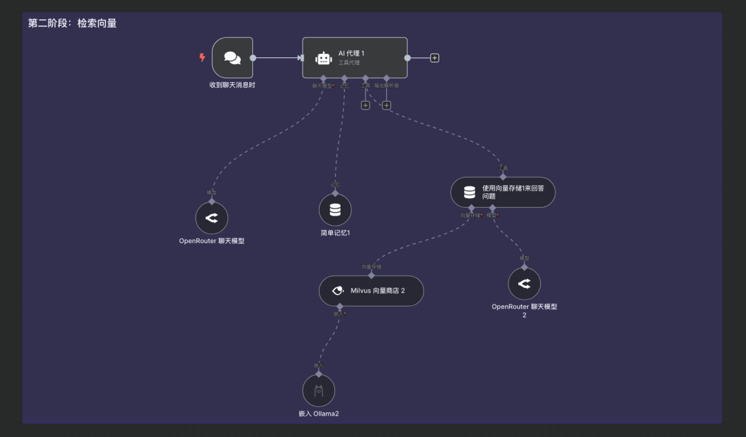 说明:本工作流共分为两个阶段。第一个阶段是文本向量化,第二个阶段是聊天对话检索向量。