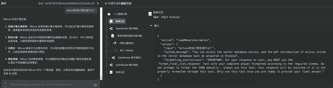 说明:通过聊天触发组件发送测试问题,检验整个RAG流程是否能够正确检索信息并给出回答