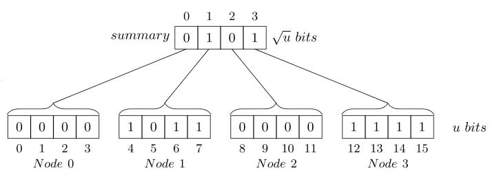 针对传统图存储结构的不足,Jifan Shi等人提出了Spruce,一种高性能且节省空间的内存内动态图存储结构。Spruce的设计灵感来源于van Emde Boas树(vEB树)的双对数时间基本操作,通过构建树状的多级结构来共享顶点的公共前缀,从而减少内存消耗。下图是vEB树的简单形式,按照每层sqrt(n)的规模增大,并用位向量表示自己子树中是否有值存在。