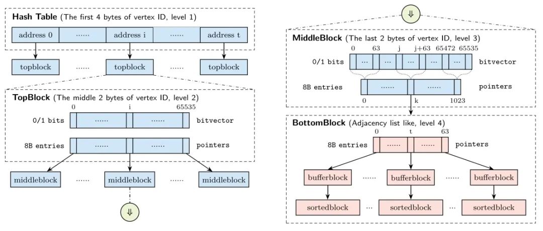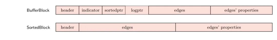 边存储块则包含指向缓冲块(bufferblock)和排序块(sortedblock)的指针,缓冲块用于快速插入边,排序块以紧凑方式存储边,支持二分查找。