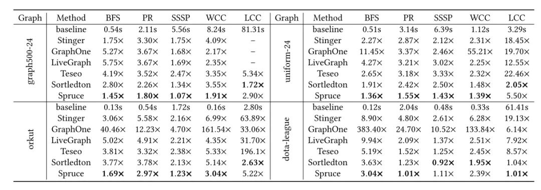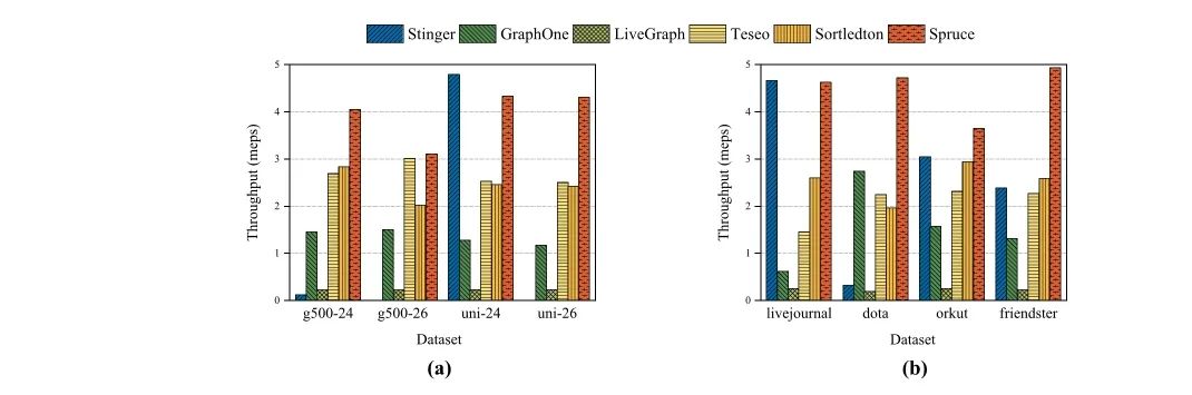 Spruce在多个数据集上进行了实验评估,包括合成数据集和真实世界数据集。实验结果表明,Spruce在图更新和查询操作方面均表现出色,相比其他先进的动态图存储系统(如Sortledton和LiveGraph),Spruce在吞吐量和延迟方面均有显著提升。特别是在处理大规模图数据时,Spruce的紧凑表示和高效并发控制协议发挥了重要作用。