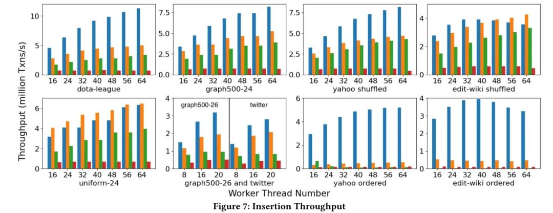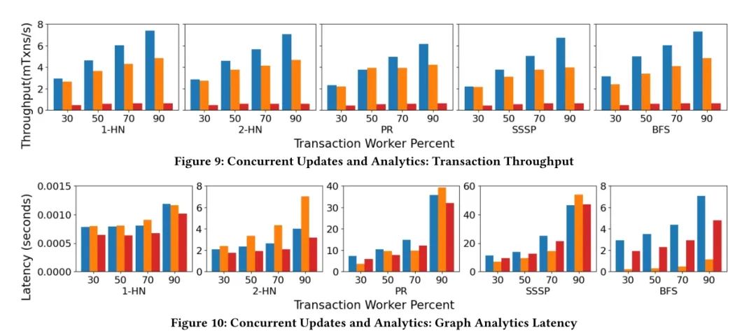 GTX同样在多个数据集上进行了广泛的实验评估,包括均匀图和幂律图。实验结果表明,GTX在事务处理方面表现出色,特别是在处理具有时间局部性和热点的工作负载时。GTX的无锁图存储结构和自适应增量链锁定协议显著提高了事务的吞吐量,同时保持了较低的延迟。此外,GTX在混合工作负载下的性能也优于其他竞争系统,证明了其在处理复杂图数据应用方面的优势。
