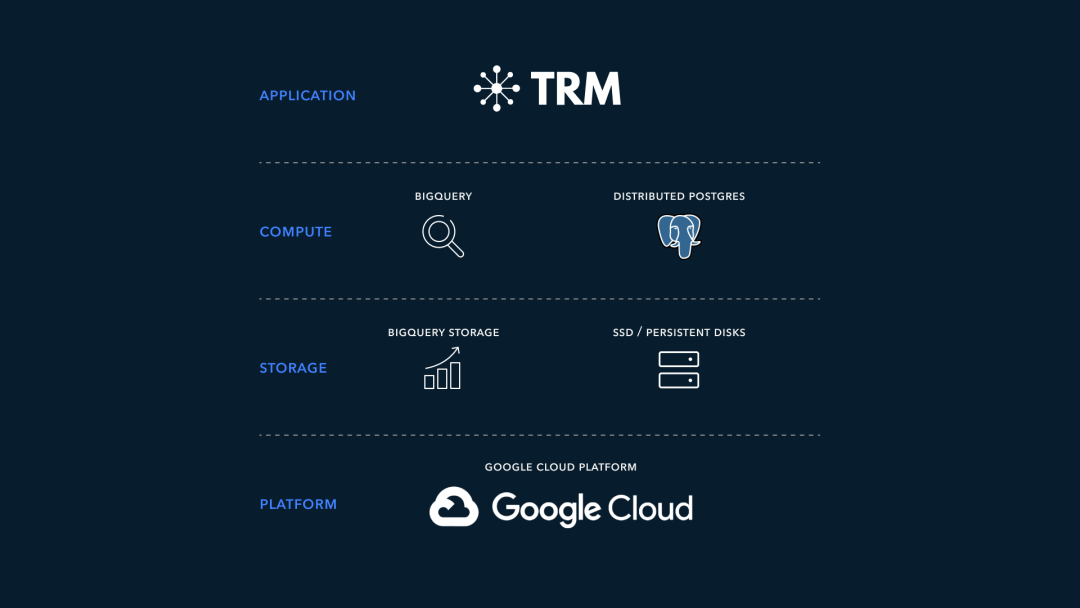 最初,TRM 构建于分布式 Postgres 与 BigQuery 之上,并通过持续优化应对业务增长。但随着本地化部署与多环境需求的兴起,现有架构面临性能与成本的双重挑战。