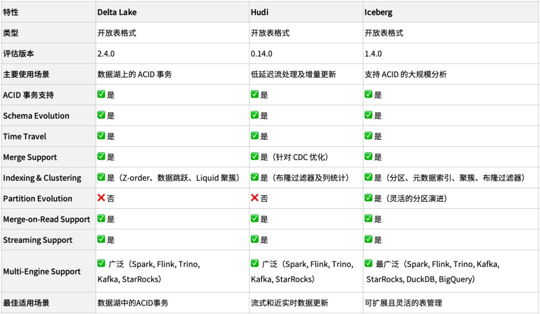 Apache Iceberg:具备开放标准、强大的模式演进能力和高效的元数据管理,满足跨引擎兼容需求。
