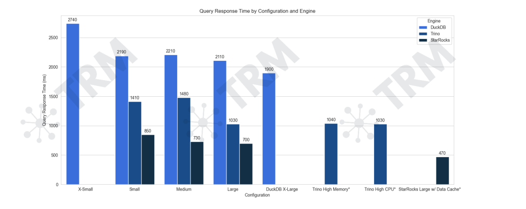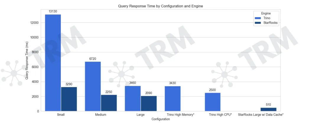 StarRocks:在所有配置中表现最优,启用数据缓存后响应时间最低可达 470 毫秒。