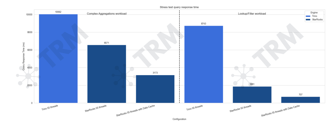 StarRocks:无论是点查还是聚合负载,在高并发下均优于 Trino,启用数据缓存后性能进一步提升。