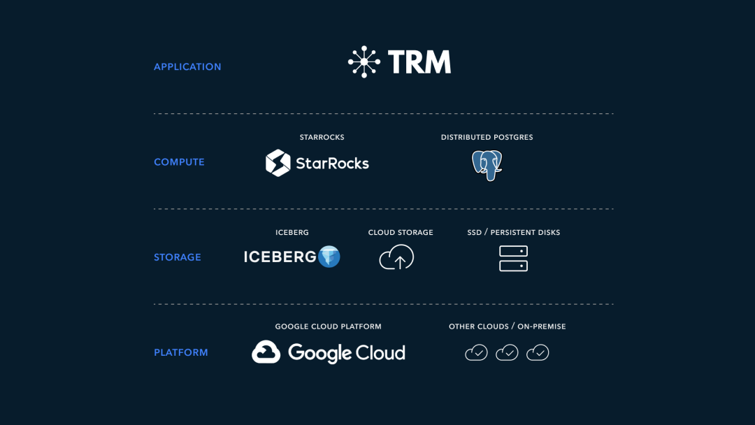 作为一家致力于打击加密金融犯罪的技术公司,TRM Labs 为全球金融机构、加密企业与政府部门提供链上数据分析与情报支持。其平台需处理来自 30 多条区块链的 PB 级数据,并以亚秒级响应支撑每分钟超过 500 次的查询请求。