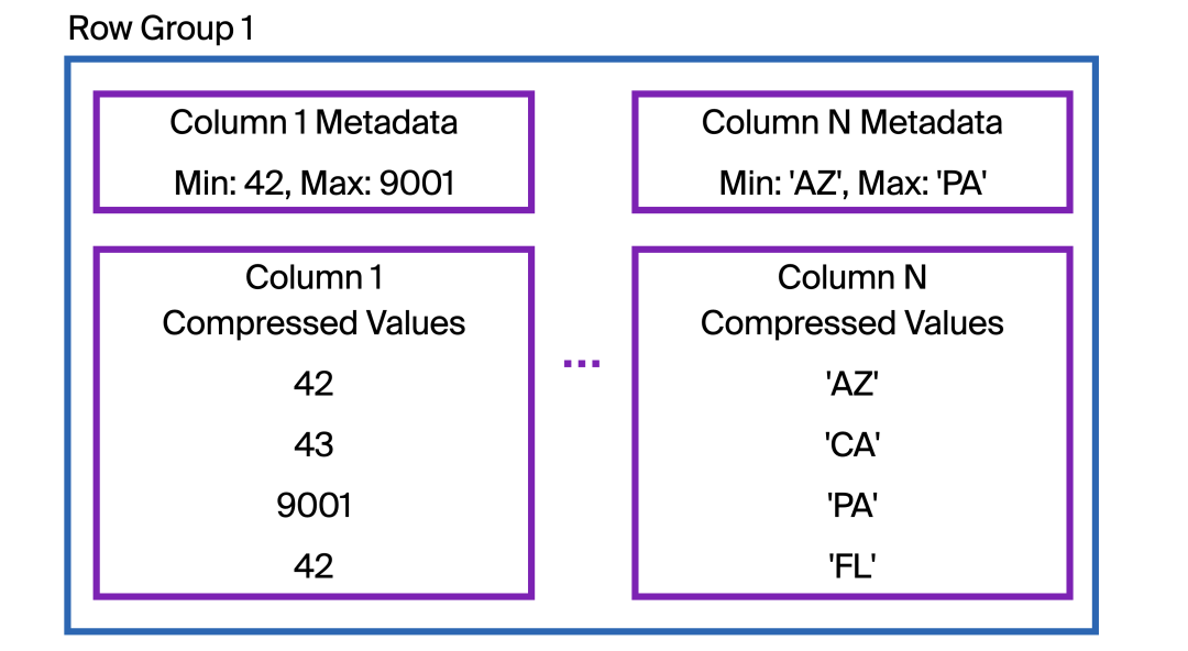 仅从 AZ到CA,则数据被跳过的可能性会大大增加。换句话说,我们想要检索的每个数据子集应该仅存储在几个行组中。我们不想提取每个行组并检查每一行!例如,最好将字母表中靠前的州/省/市/自治区都分组到同一个行组中。
