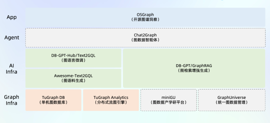 中间层:包含业内首个开源图原生智能体系统Chat2Graph、DB-GPT-Hub/Text2GQL(图语言微调)、Awesome-Text2GQL(图语料生成)、DB-GPT/GraphRAG(图检索增强生成)。