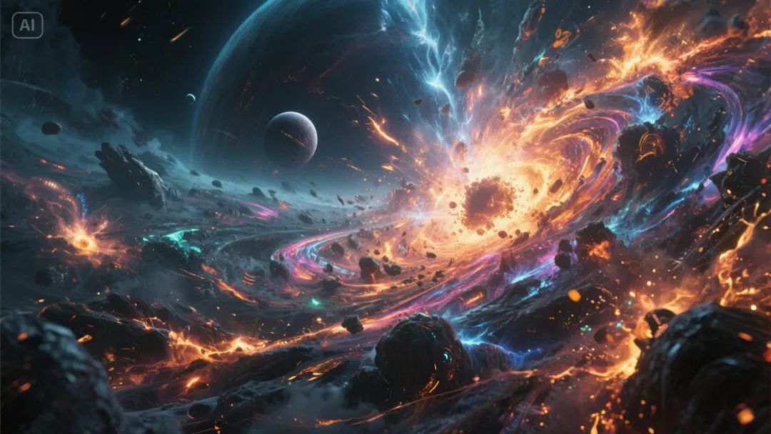 三体宇宙初始混沌状态,各种能量和物质相互交织、碰撞,形成扭曲的时空和绚丽的光芒,科幻风格,全景,神秘、宏大氛围