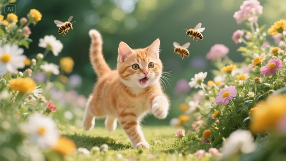 结果:小猫跳跃动作真实,蜜蜂飞行路径自然,整体节奏连贯。完全可以拿来做童趣动画短片!