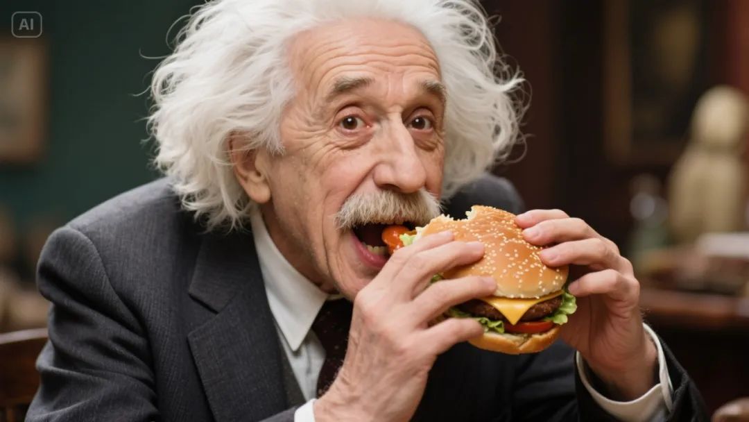 爱因斯坦穿着经典的西装,留着标志性的白发和胡须,正拿着汉堡大快朵颐,幽默搞笑风格,特写,轻松诙谐氛围,夸张修饰