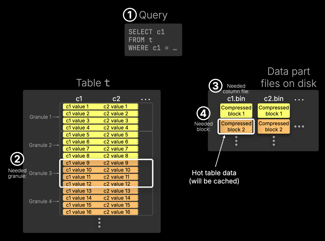 从技术角度来看,热表数据是指列文件中与本次查询命中 granule 对应的压缩数据块。这些块会从磁盘中读取,并缓存至内存,以加速未来的查询。