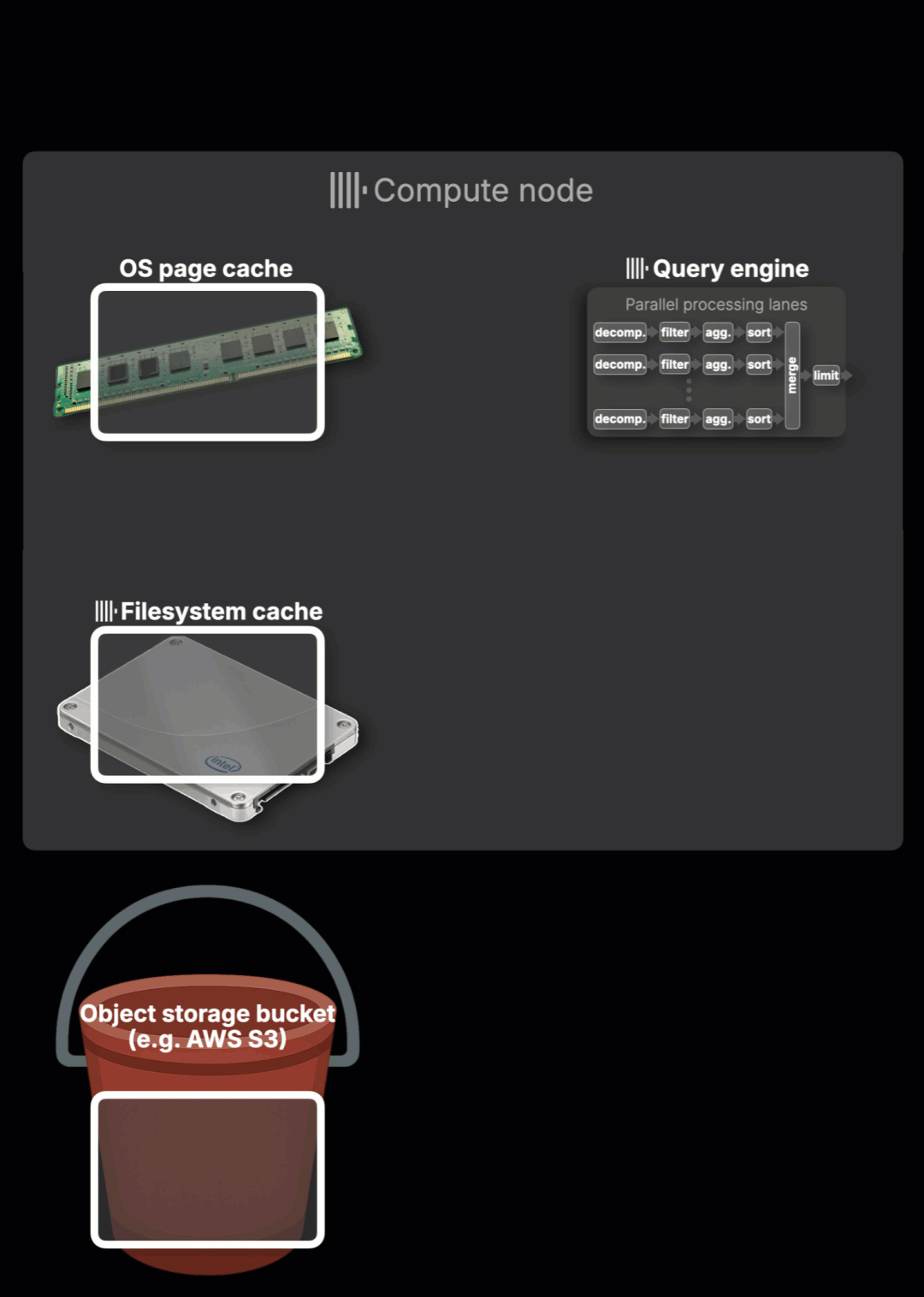 尽管对象存储的吞吐量可以通过优化达到可接受水平,但访问延迟却往往成为性能瓶颈。为了弥补这一差距,ClickHouse Cloud 选择在计算节点上部署直连 SSD,构建本地文件系统缓存,作为对象存储与内存之间的中间缓冲层。