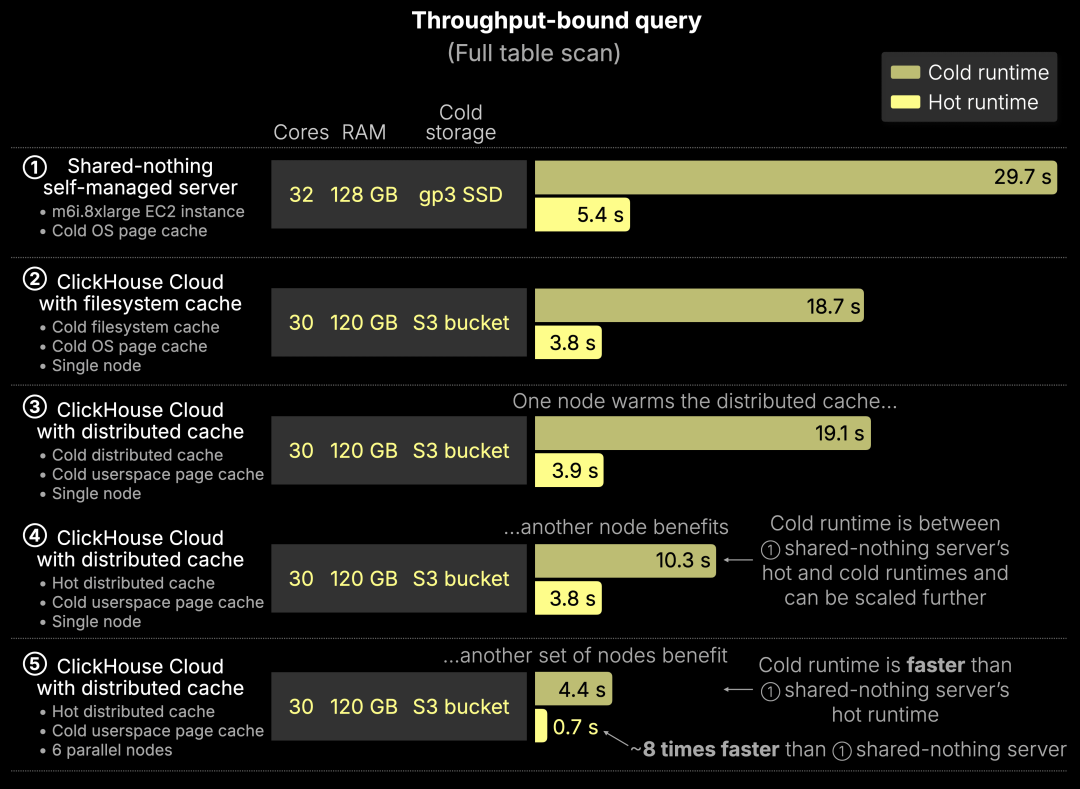 需要说明的是,这里的分布式缓存机制与下文提到的内容并无直接关系。我们还在探索将 Amazon S3 Express One Zone(AWS 上延迟最低的云对象存储)集成至主存储与缓存体系中。该方案具备个位数毫秒级延迟,有望进一步改善性能与成本结构。点击阅读更多 →【https://aws.amazon.com/cn/blogs/storage/clickhouse-cloud-amazon-s3-express-one-zone-making-a-blazing-fast-analytical-database-even-faster/】