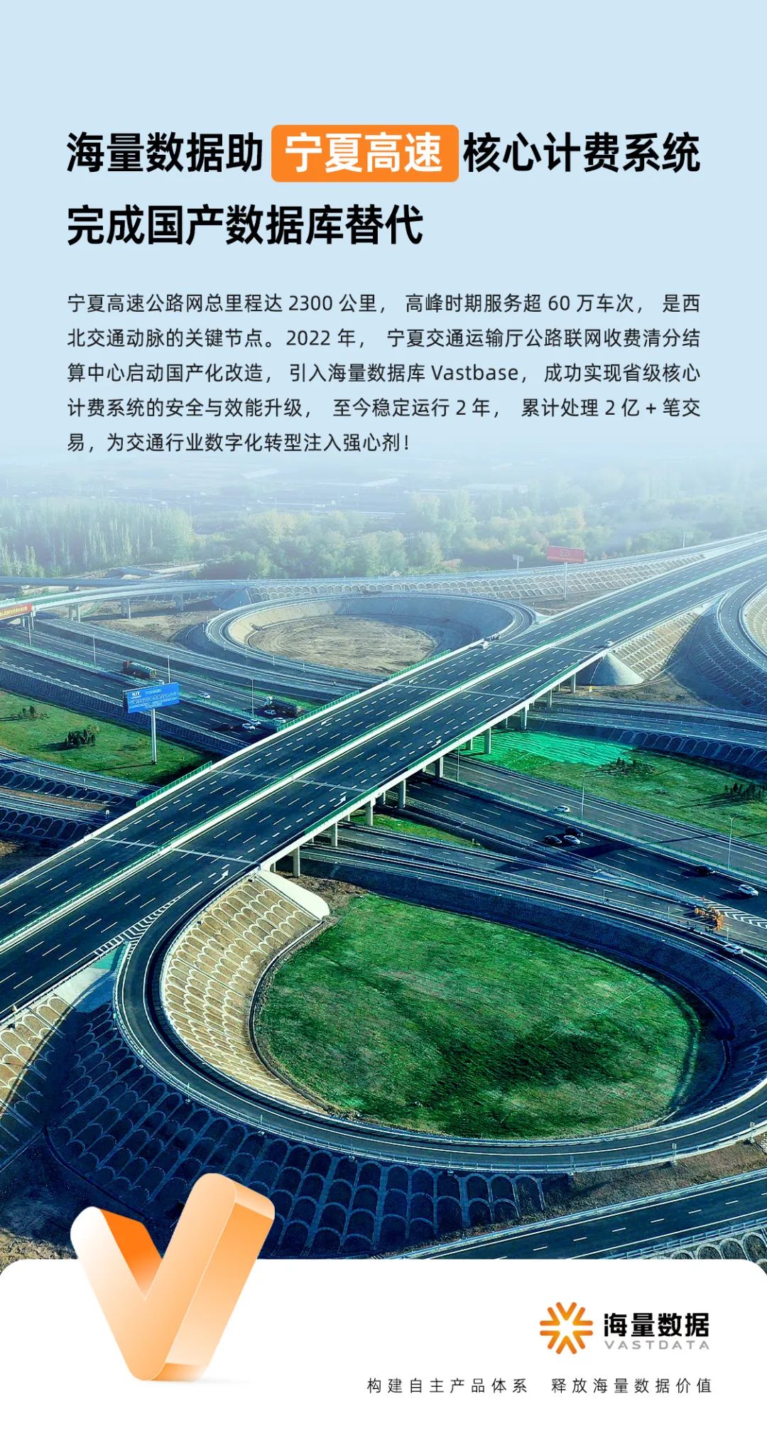 宁夏高速公路网总里程达2300公里,每次高峰时期服务超60万车次,是西北公路交通的关键一环。2022年,宁夏交通运输厅公路联网启动国产化改造工作,引入海量数据库Vastbase,实现省级核心计费系统的安全与效能升级。