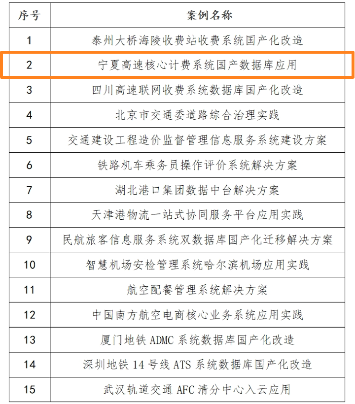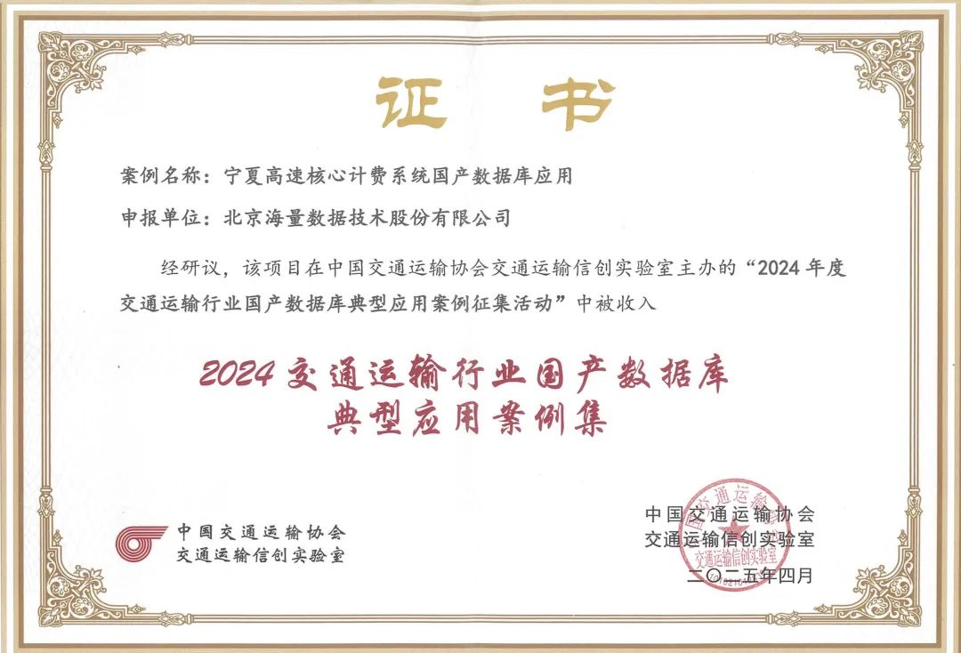 近日,在中国交通运输协会交通运输信创实验室和数字中国创新大赛·信创赛道组委会组织的2025数字中国创新大赛·信创赛道颁奖仪式暨“信创+AI”主题活动上,宁夏高速核心计费系统国产化替代项目入选《2024年度交通运输领域国产数据库典型应用案例集》。