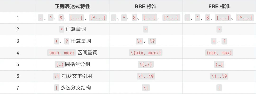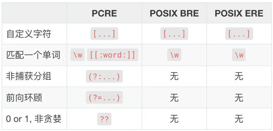 篇幅原因,仅提供部分需要关注的对比,具体看【附录-PCRE、GNU BRE、GNU ERE 对比】。如果读者对贪婪和非贪婪模式感兴趣,可以了解一下正则表达式的执行引擎,或许会让你对正则表达式产生新的看法。