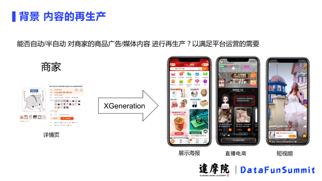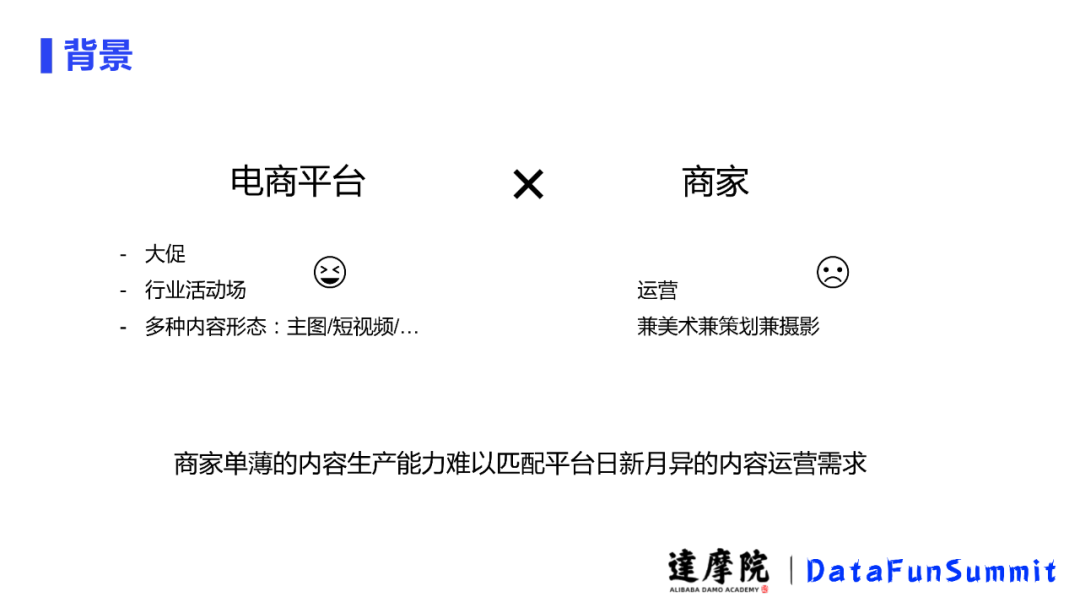 电商平台和商家处在不对等的情况,对于商家而言,他自己辛苦做详情页、做海报、策划等已经很辛苦了,此时此刻对平台而言又希望商家能做更多的活动服务于平台,带来更多流量。由此可见,电商平台过多的活动让能力有限、产出能力单薄的商家无法招架,那怎样在不打扰商家的情况下自动或半自动的生成对应的广告媒体内容以满足平台的运营需要成为了一个难题,由此,我们的内容生产方案应运而生。