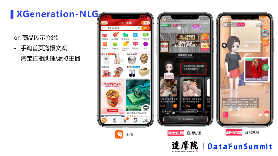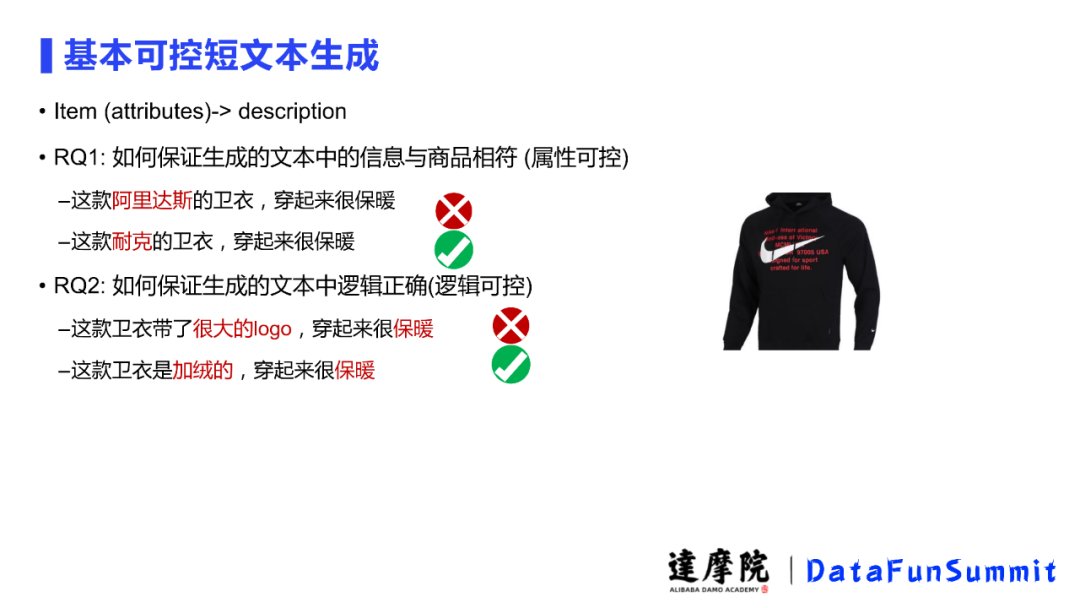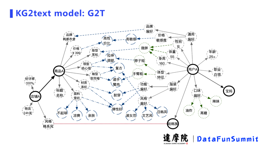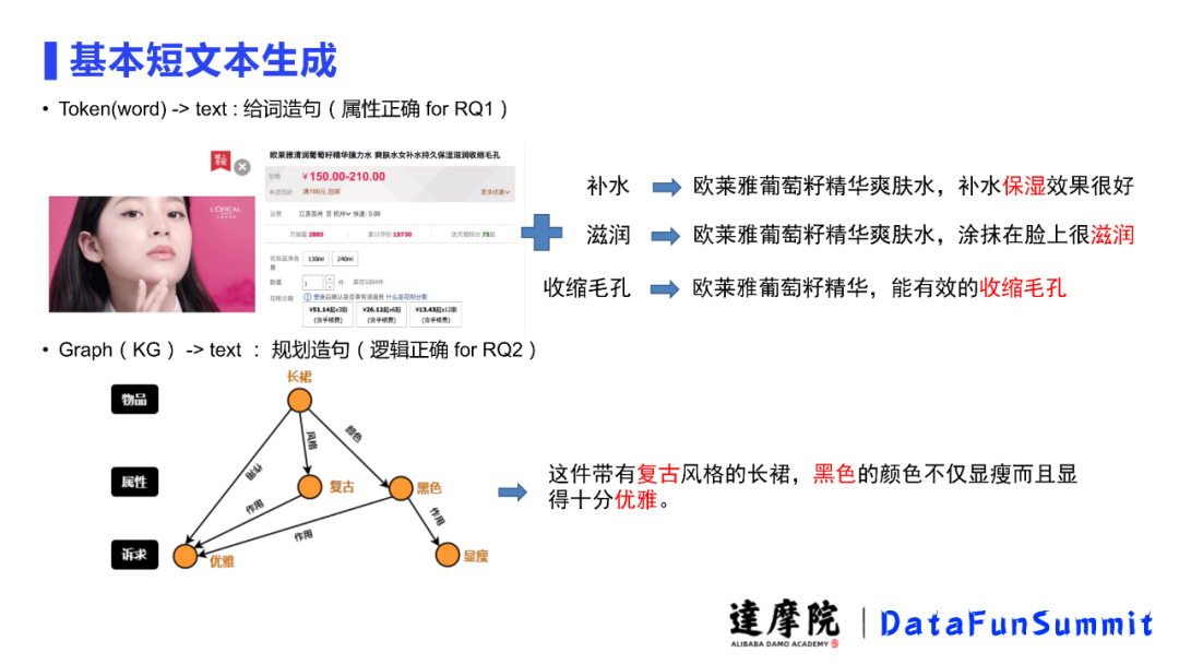 除了商品上的延展之外,图右边我们在用户的身上对其也进行一些不涉及个人隐私的个人属性延展,比如这个用户身高体重、体型、口味偏好等,并推送适合这个用户的、保证商品属性对的的商品,生成其喜欢的商品文案。
