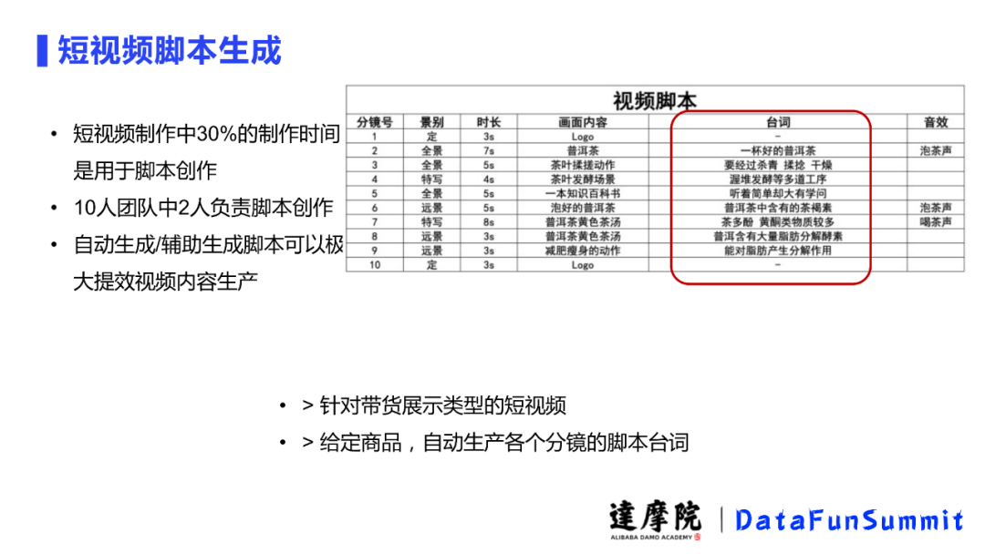 在短视频制作当中,大部分时间是用在拍摄素材整理中的,而另一部分就是用在写脚本中的。写脚本,其实是一件很复杂的事情,以我们列举了一个视频脚本为例可以看出一个视频脚本包括分镜号、景别、时长、画面内容、台词还有音效。实际过程中会有很多人参与这个创作过程,那么如果机器能够批量快速的自动生成自动分镜的角度台词,就能节约很多人力资源和时间资源了。