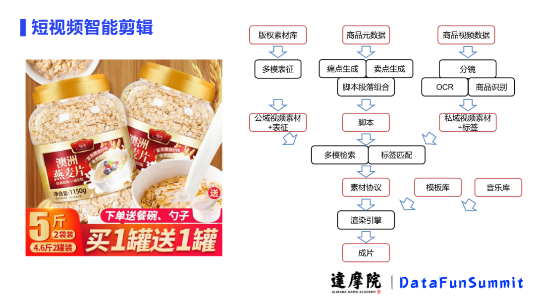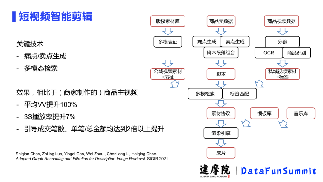这是整个短视频的一个自动剪辑生成。这条生产内幕中先由三个方面来导向,首先通过对商品元数据痛点生成、卖点生成拿来一起做一个脚本段落组合,此处的脚本生成是两级段的(即痛点和卖点);段落组合后,我们购买一些版权素材库做了一个多模表征,得到的向量和公域视频素材放到一起连接脚本把文案挂载到素材上面,让内容和画面能匹配,使得每个分镜都有对应文字;除此之外,我们还会利用商家的商品视频数据加上私域视频素材和标签,多模检索并标签匹配后,再经过素材协议、渲染引擎,添加模板库、音乐库后就导出了成片。