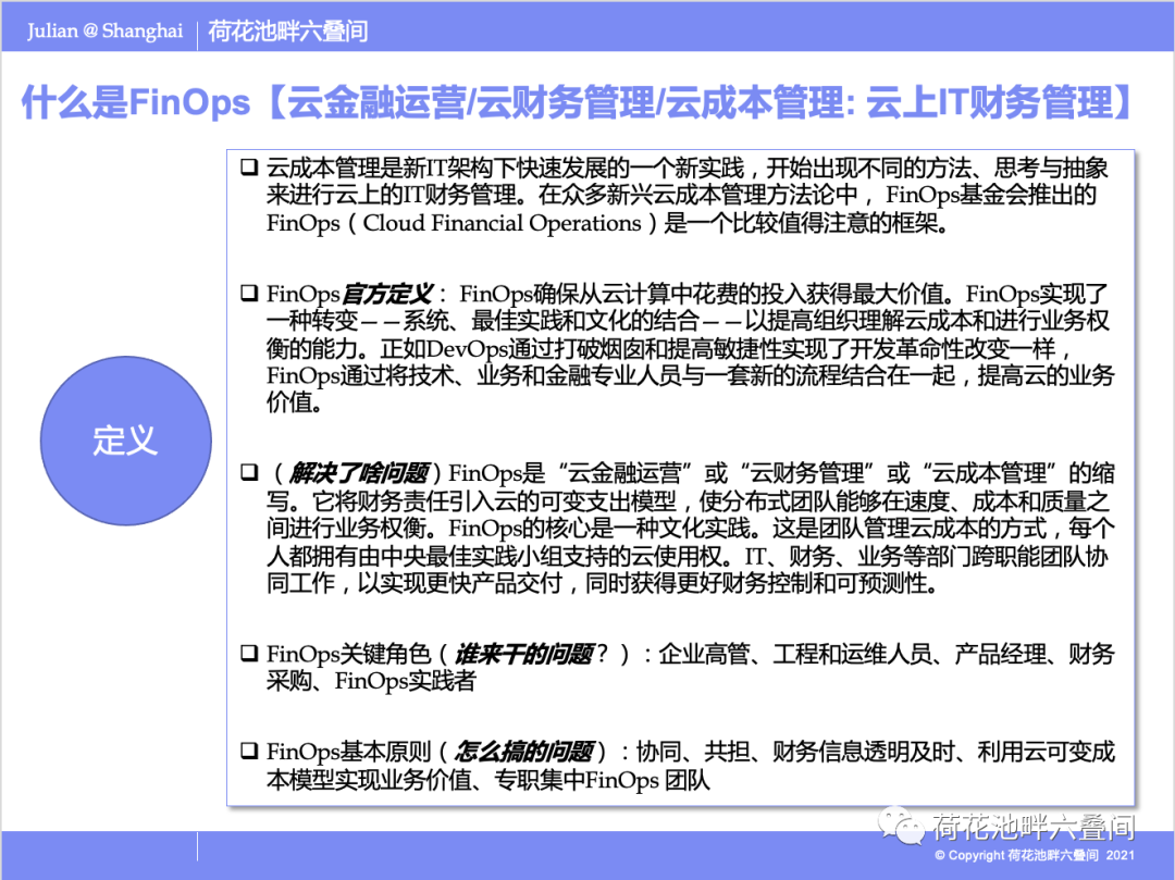 FinOps基本原则(怎么搞的问题):协同、共担、财务信息透明及时、利用云可变成本模型实现业务价值、专职集中的FinOps 团队。