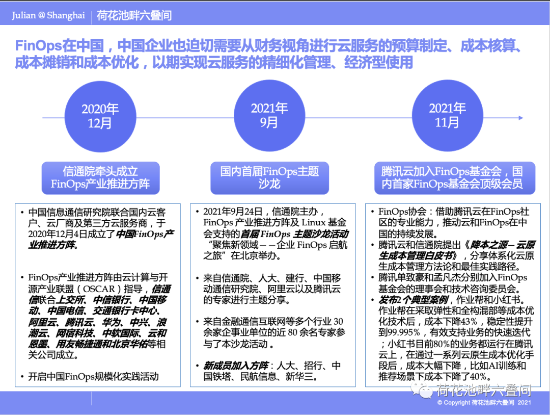 中国企业也迫切需要从财务视角进行云计算的预算制定、成本核算、成本摊销和成本优化,以期实现云服务的精细化管理、经济型使用。目前为止,观察FinOps在中国的三个大的事件,FinOps已悄悄在中国萌芽发展了。