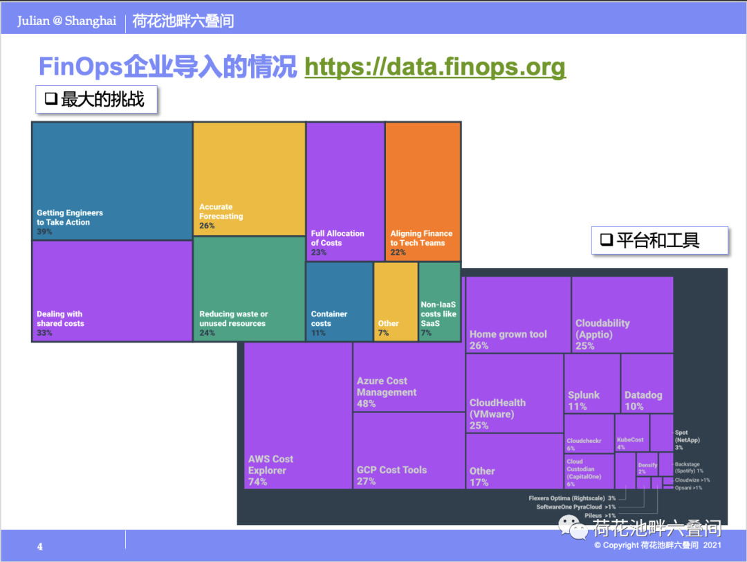 FinOps基金会年度会进行FinOps现状调查,并发布报告《The State of FinOps Report》。 2021年企业客户上云的最大的挑战和领先企业对云财务管理使用的平台和工具如下图所示。