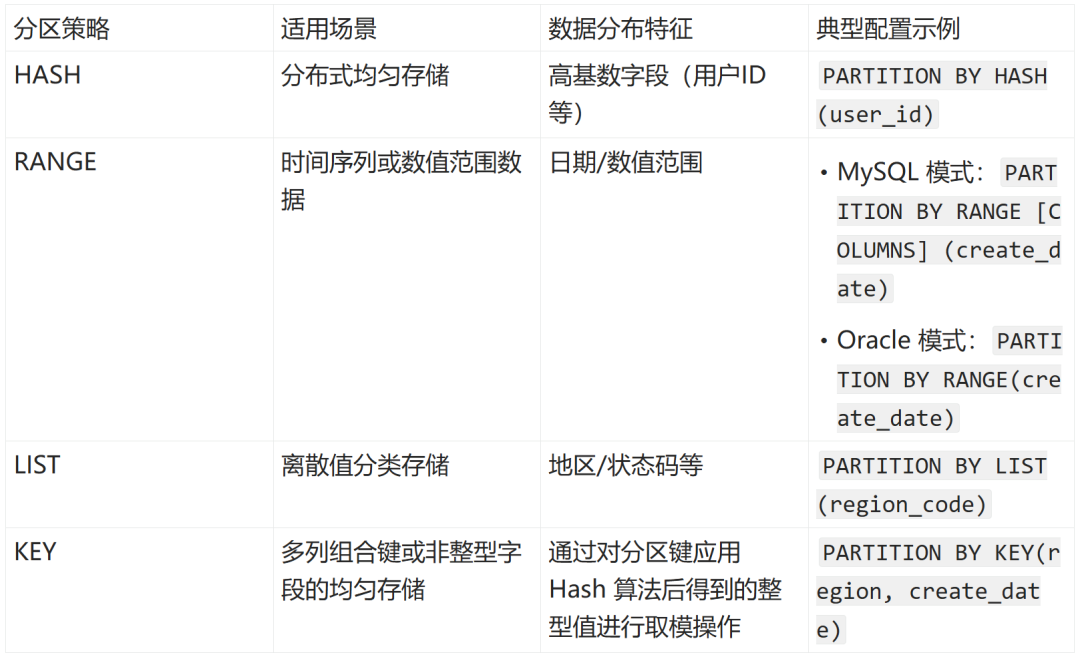 👉 Hash/Key 分区键需选择高基数、无倾斜、高频查询的字段,如用户 ID、订单号等。