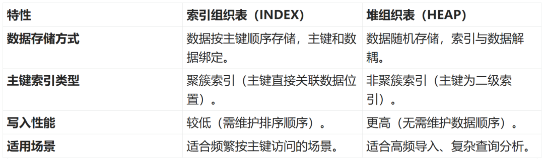 1、索引组织表与堆组织表对比