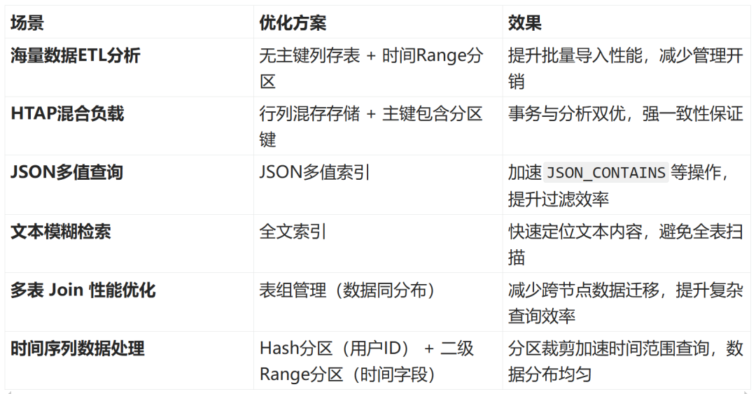 4、二级分区:AP 场景优先按时间或业务维度字段设计二级 Range 分区(如按季度划分),无需避免低基数字段,但需确保分区逻辑与查询模式匹配。
