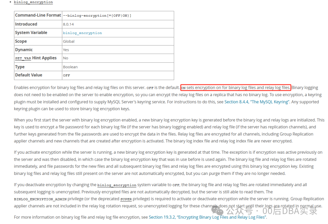 是 8.0.14 引入的,红色的框框起来的说明了会对 binary log files 和 relay log files 都加密。