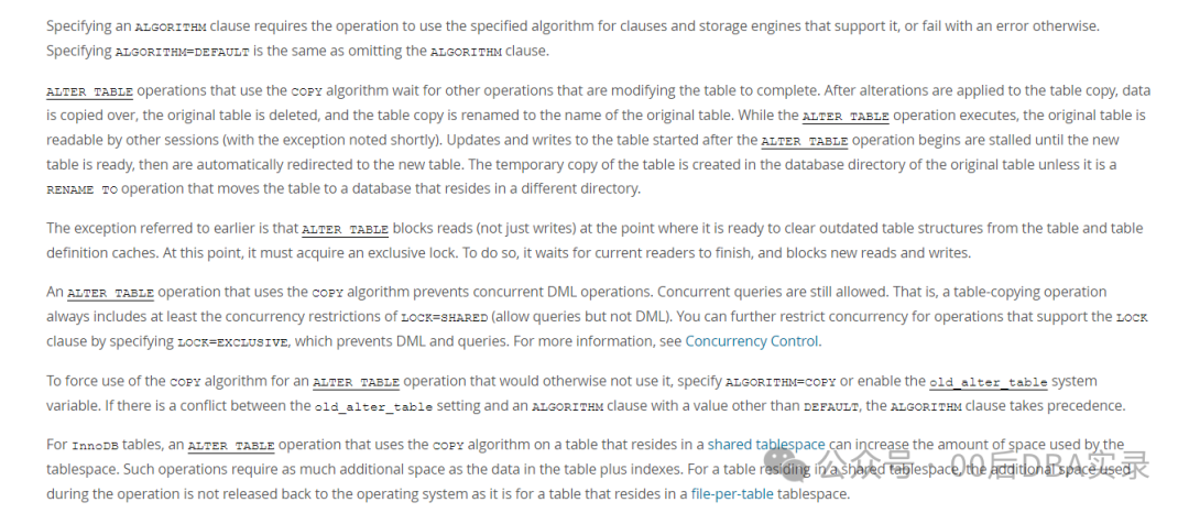 ALTER TABLE 操作使用 COPY 算法时,会阻止同时进行的 DML 操作(如 INSERT、UPDATE 等)。虽然查询操作仍然允许,但这些操作相当于在 LOCK=SHARED 的限制下运行(允许查询,但禁止 DML)。如果使用 LOCK=EXCLUSIVE,则会阻止所有查询和 DML 操作。