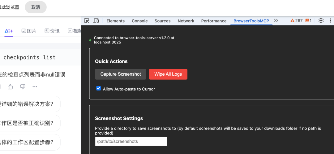 npx @agentdeskai/browser-tools-mcp@1.2.0(Use `node --trace-warnings ...` to show where the warning was created)Successfully found server at 127.0.0.1:3025Successfully discovered server at 127.0.0.1:3025