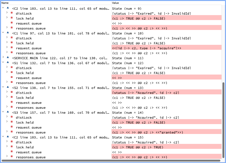 4.S4: 为了模拟客户端持有的分布式锁过期,如果某个客户端已经获取分布式锁,服务端可以在任意时刻将锁设置为过期状态。由于 TLA+ 在同一个标签下的所有操作都是原子完成的,而现实情况中,服务端处理请求和回复响应(分别对应 S2 和 S3)并不是一个原子操作,所以将这两个操作分别放到不同标签下。