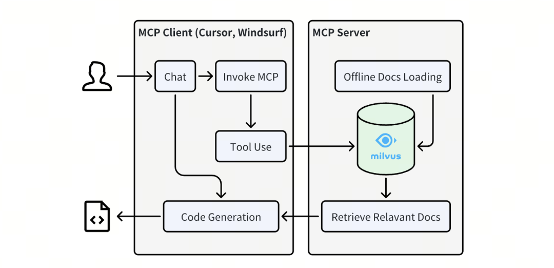 从 RAG 角度看,主要看图中右侧 MCP Server 部分,服务端事先将文档信息向量化,并在 Milvus 数据库进行离线索引(Offline Indexing)。当 MCP tool 进行 Milvus 向量查询时,通过向量语义检索,获取相关的文档和代码片段。检索到的片段返回给 MCP 客户端,结合 LLM 大模型进行准确的代码生成。