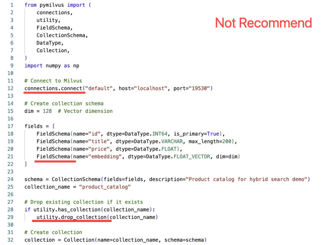 使用官方最新推荐的MilvusClient接口来创建Collection | 使用老旧的ORM接口创建Collection,不推荐 |