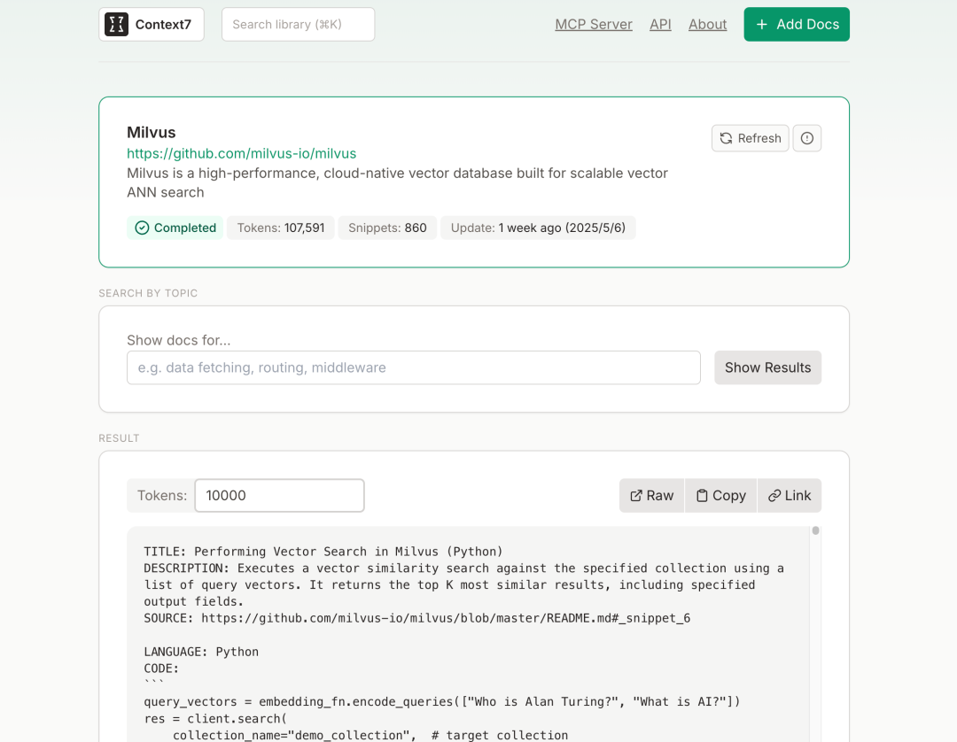 而关于怎么让模型看世界,除了我们提供的 Milvus Code Helper MCP 服务外,开发者还可以选择如 Context7、DeepWiki 等新兴工具来解决这类问题。这些工具或服务通常基于 MCP 或 RAG 等技术框架,通过不同的方式向AI模型注入最新的项目文档和代码示例,以提升生成代码的准确性和相关性。