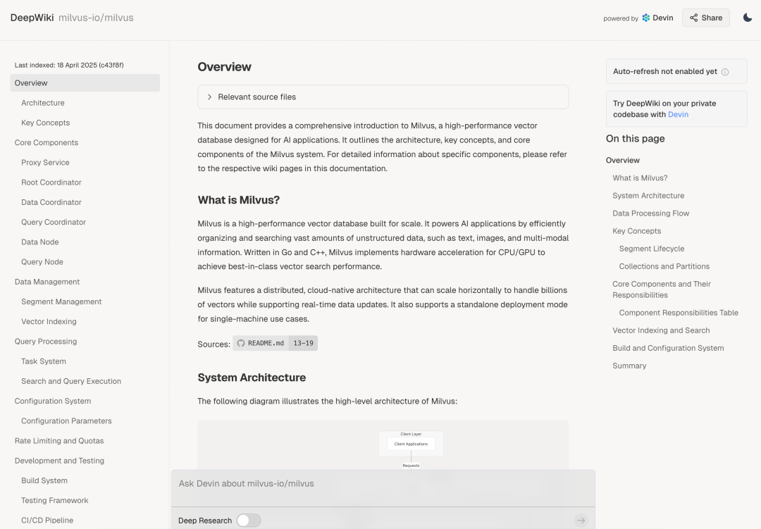 DeepWiki支持自定义导入github仓库,他更关注代码文件,也因此容易忽略项目文档里的信息。