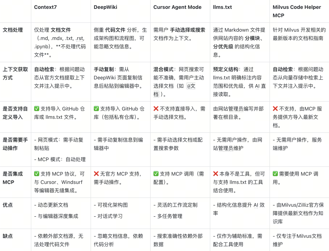 客观来说,以上这些工具的通用性更强,可以应用于更多不同类型的项目和需求中。但Milvus Code Helper MCP 针对的是特定的应用开发场景,尤其是围绕 Milvus 数据库的开发工作,可以提供更为精准和优化的服务。它不仅能够自动从官方来源获取最新的文档信息,还能够无缝集成到现有的开发环境当中,为用户提供了一个高效、准确的知识助手。