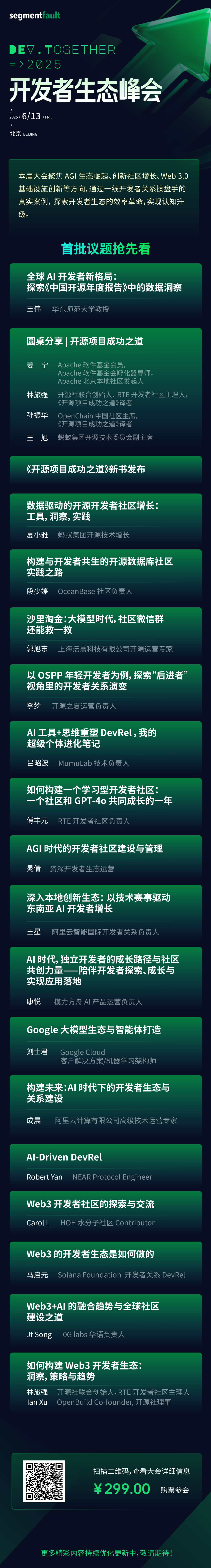 此外,你可以在 AGI 生态的崛起分论坛中,了解中国开发者崛起历程、独立应用落地与智能体策略,直击 AI 时代开发者关系的重塑逻辑;你也能在 Web3 生态的崛起分论坛中,与我们共同探索 AI 驱动的创新,和去中心化生态构建的密码;你还可以在创新社区增长分论坛中学习如何利用 AI 从微信群碎片信息中“淘金”,以及如何将自己打造成“超级个体”。此次为首批议程发布,还有来自 CNCF、GitHub、华为、字节跳动、亚马逊云科技等公司的专家即将加入我们,后续第二批议程敬请关注!