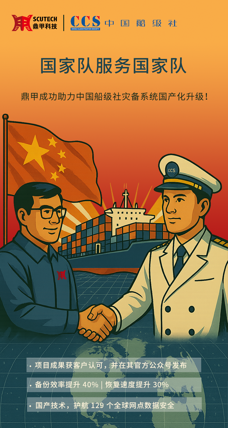 近日,鼎甲作为数据安全国家队成功完成对中国船级社(China Classification Society,简称“ CCS ”)备份系统的国产化升级改造,获得中国船级社的高度认可,项目成果在客户公众号上得到发布。这不仅是一项项目成果的落地,更是“国家队服务国家队”的典范之举。