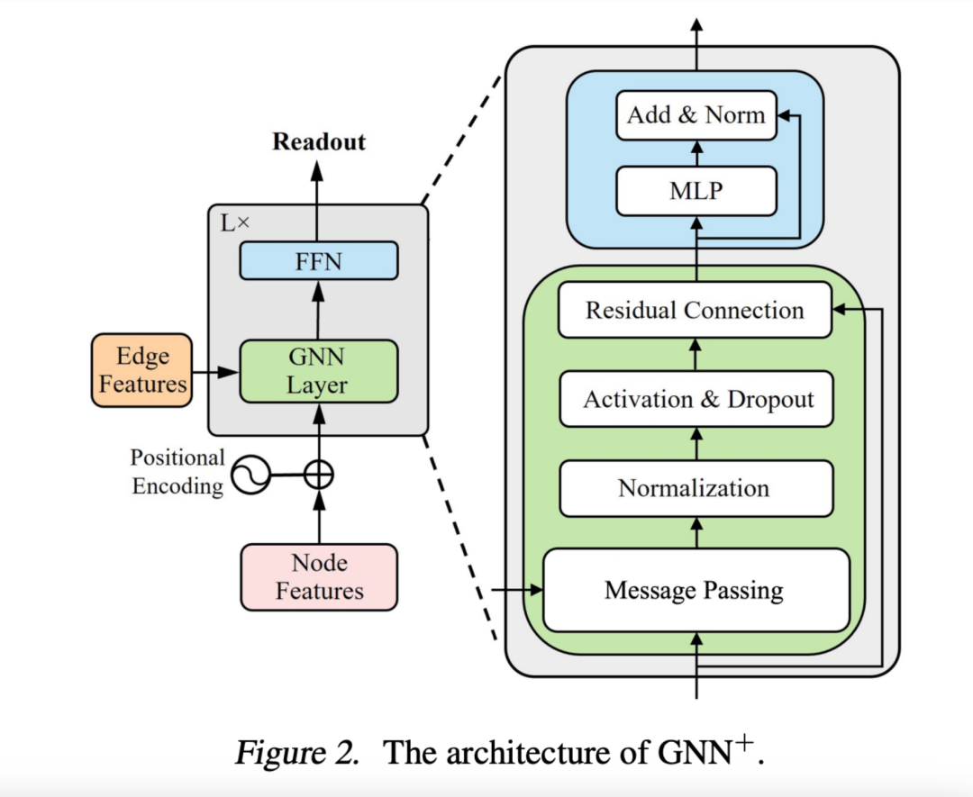 为此,本文构建了GNN+框架,在三类经典GNNs模型(GCN、GIN、GatedGCN)基础上,引入六项被广泛使用的超参数技术(边特征整合、归一化、Dropout、残差连接、前馈网络、位置编码),全面评估其在14个广泛使用的大规模图级任务数据集中的表现。主要发现如下: