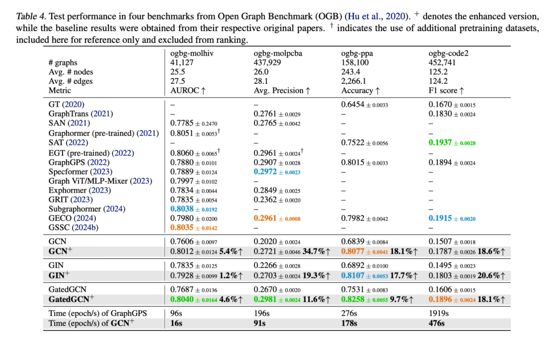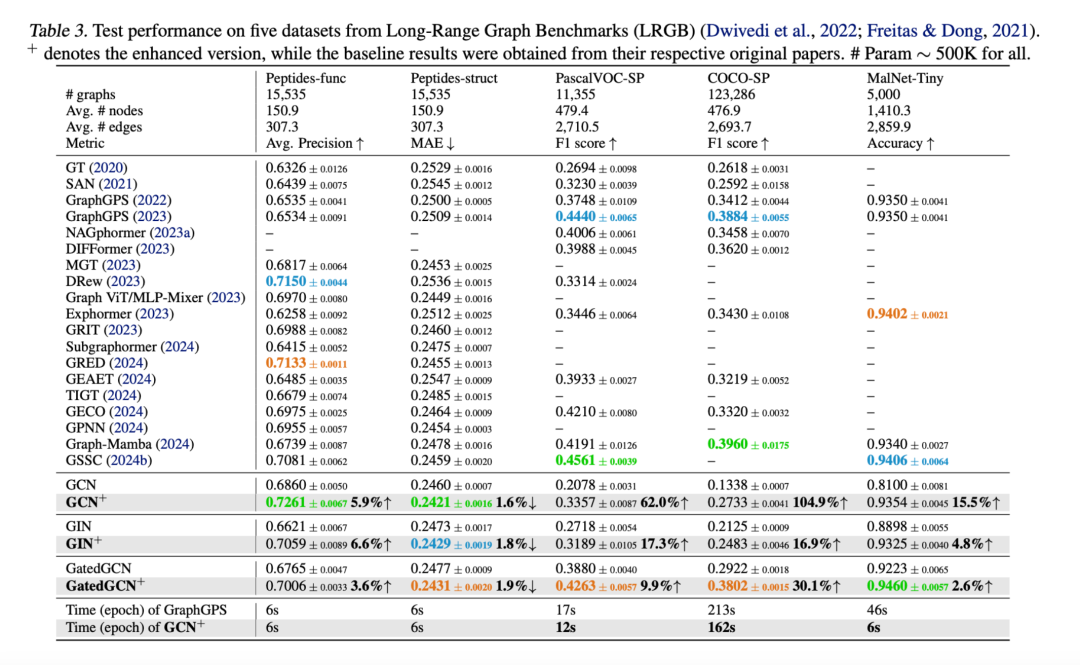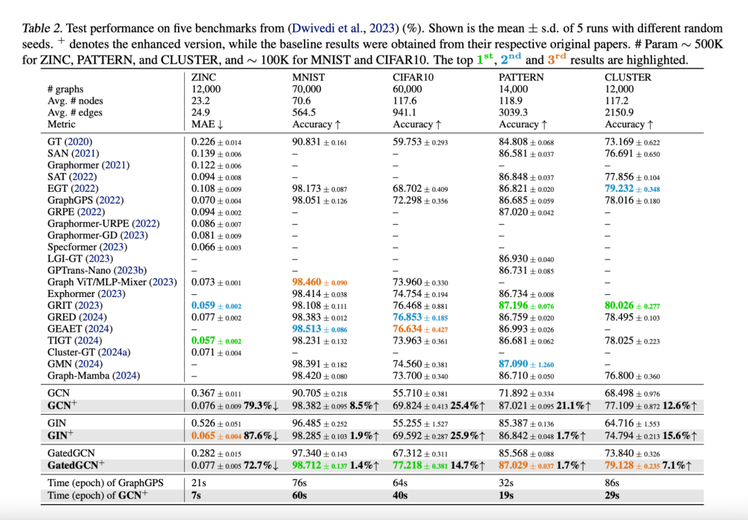 结果显示GCN+、GIN+和GatedGCN+三者在所有数据集均进入前三,其中8项任务取得第一,整体性能全面对标甚至超越主流GTs与GSSMs: