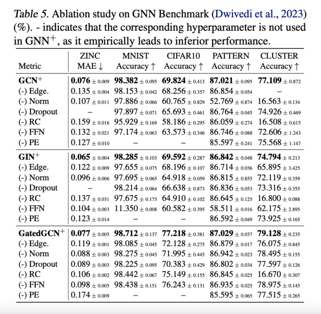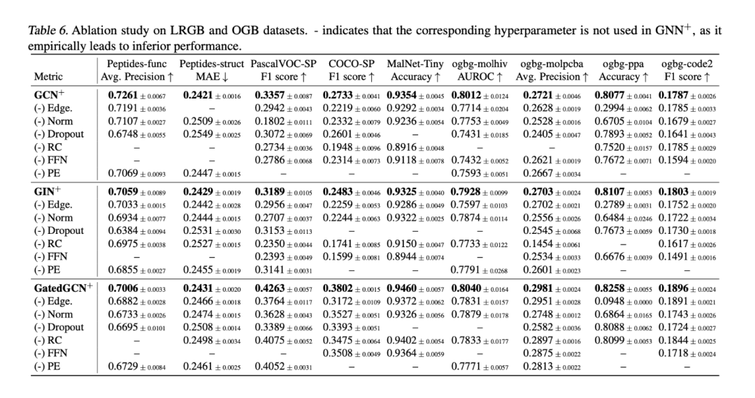 本研究对GNN+框架中的六个超参数模块(边特征、归一化、Dropout、残差连接、前馈网络、位置编码)进行逐一消融,结果表明各模块均为性能提升的关键组成: