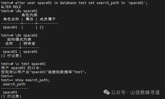 ksql -U system -d test#创建用户CREATE USER space01 PASSWORD 'space01';#创建模式create schema space01 authorization space01;#设置参数search_path 为space01ALTER USER space01 IN DATABASE test SET search_path to 'space01';#查看\du space01\dn space01\c test space01SHOW search_path ;