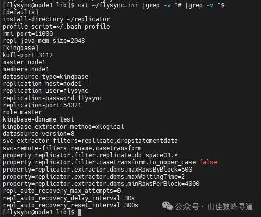 #1、创建Kingbase FlySync配置文件#2、配置Kingbase FlySync配置文件cd install/KingbaseFlySync-*-replicator/flysync-replicator/samples/inicp flysync_kingbase8_source.ini ~/flysync.inivi ~/flysync.ini------------写入内容----------[defaults]# 安装目录install-directory=~/replicator# 环境变量脚本位置profile-script=~/.bash_profile# rmi端口,默认11000rmi-port=11000repl_java_mem_size=2048# 服务名[kingbase]# 监听kufl获取的端口kufl-port=3112# master主机名master=node1# 当前主机名members=node1# 数据源类型datasource-type=kingbase# 同步数据库信息replication-host=node1replication-user=flysyncreplication-password=flysyncreplication-port=54321# 同步服务角色role=master## 指定连接的数据库名称; 源端时,需指定解析方式kingbase-dbname=testkingbase-extractor-method=xlogical## kingbase 版本号datasource-version=8## 过滤器开关配置# svc_extractor_filters=replicate,casetransform,dropcolumn,renamesvc_extractor_filters=replicate,dropstatementdatasvc-remote-filters=rename,casetransform## 集群参数# property=replicator.datasource.global.connectionSpec.use_cluster=true# property=replicator.datasource.global.connectionSpec.slave_add=192.168.28.176,192.168.28.176# property=replicator.datasource.global.connectionSpec.slave_port=1521,1521### 过滤器详细配置## replicate 表过滤property=replicator.filter.replicate.do=space01.*# property=replicator.filter.replicate.ignore=PUBLIC.T1## casetransform 大小写转换property=replicator.filter.casetransform.to_upper_case=false## 优化参数# 达到多少条记录后,分事务,默认 500property=replicator.extractor.dbms.maxRowsByBlock=500# 若多少秒没有新的事务产生,那么就直接返回该事务,不再等待合并property=replicator.extractor.dbms.maxWaitingTime=2# 大事务优化参数property=replicator.extractor.dbms.minRowsPerBlock=4000# 自动恢复尝试次数,系统 OFFLINE 时,尝试将系统重新置于ONLINE状态的次数repl_auto_recovery_max_attempts=0# 系统 OFFLINE 时,尝试 ONLINE 之前的等待时间,s(秒)、m(分钟)、h(小时)repl_auto_recovery_delay_interval=30s# 系统自动恢复次数重置时间,s(秒)、m(分钟)、h(小时)repl_auto_recovery_reset_interval=300s##-----------------------分割线------------------###查看配置文件内容#cat ~/flysync.ini |grep -v ^# |grep -v ^$